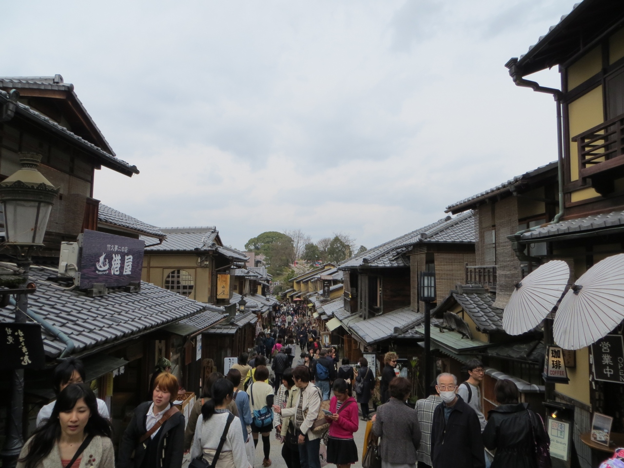 東山の桜見物。清水寺から産寧坂を通って二年坂へ。はっきりした境目はわかりませんが、とても風情のある場所で観光シーズンには観光客でいっぱいになります。両側にお土産屋さんやテイクアウトの甘味処が並んでいて飽きずいつ来ても楽しい場所です。