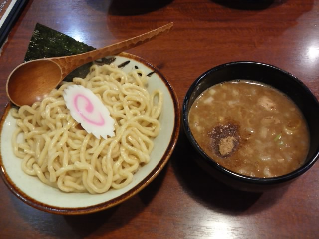 つけ麺の汁は豚骨・鶏ガラ・魚介から作ってるらしがでカツオ節の香りが強く感じられました。かなり濃厚で麺にしっかり絡む感じです。麺はモチモチの太麺。つけ麺の汁を薄めるスープも付いてきます。