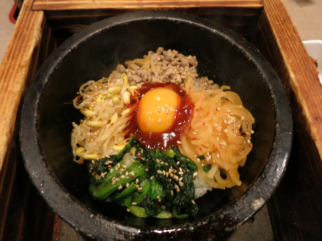 石焼ビビンパと焼肉セットを頼みました。ビビンバは小さな黒い石焼釜に入って出てきました。