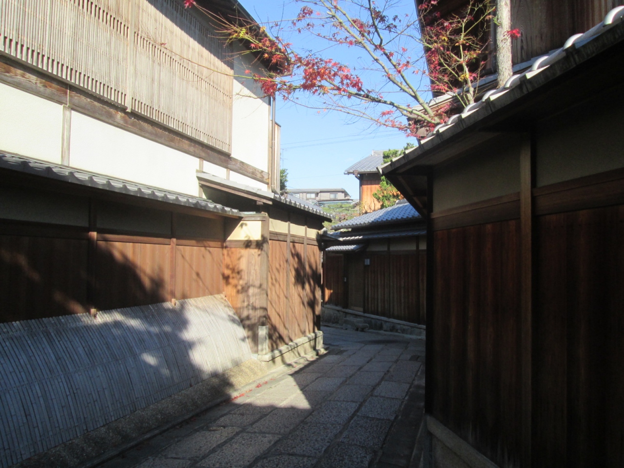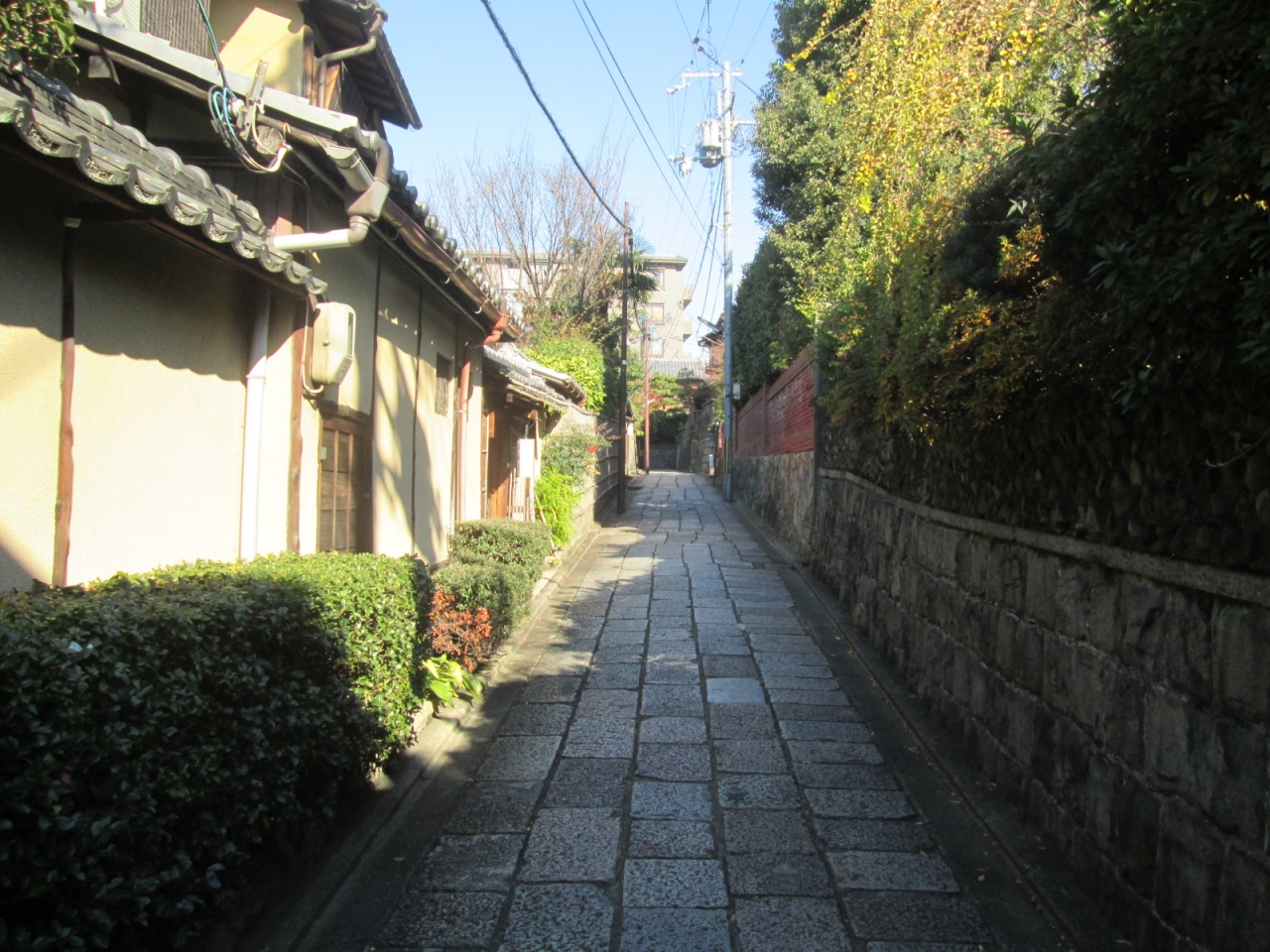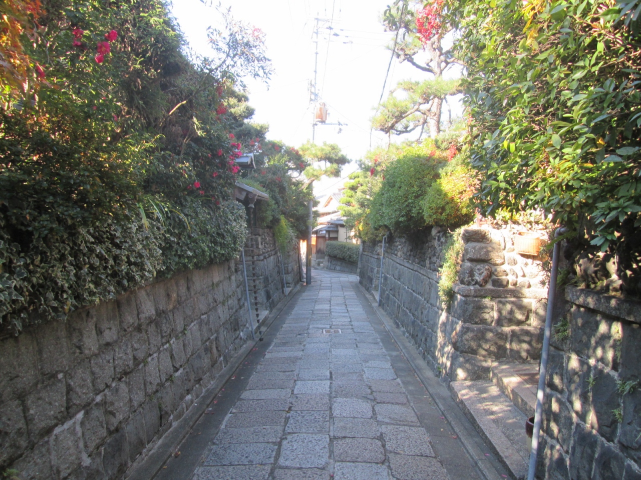 いわゆる”ねねの道”の一角から”石塀小路”へ入りました。入口あたりは風情のある木造の塀を持つ旅館や料亭などが並んでいます。このまま小路を進んで行くと、間もなく石塀や土塀が目立つようになります。私が幼い時を過ごした場所が、まさにこうした場所で、思わず懐かしさがこみ上げました。