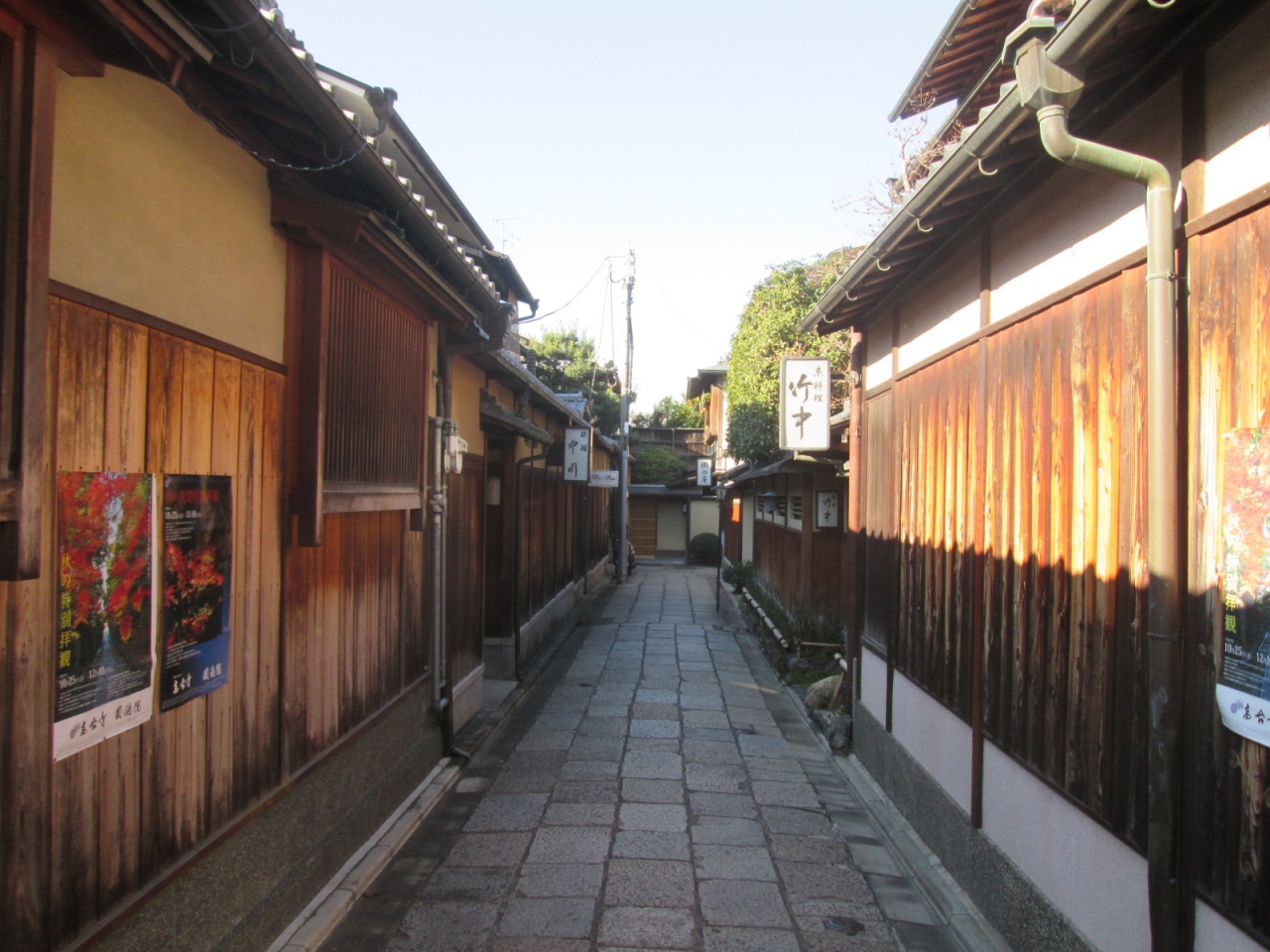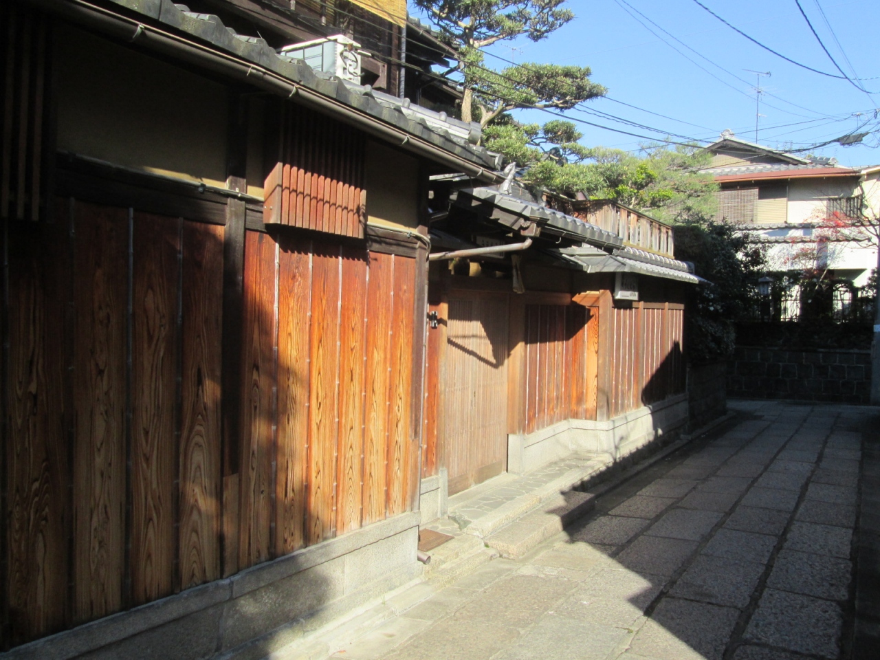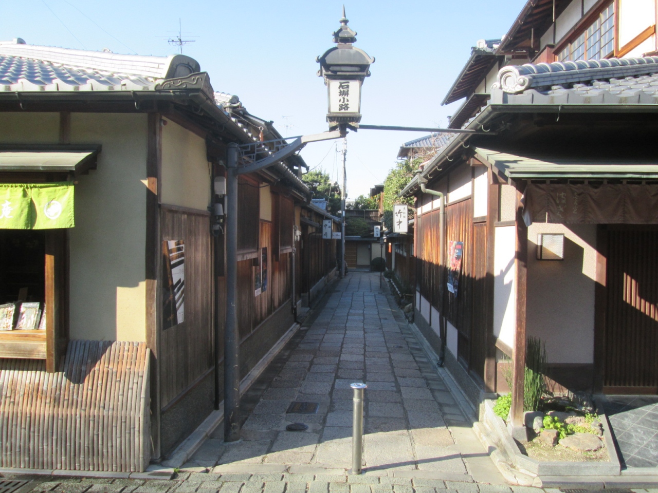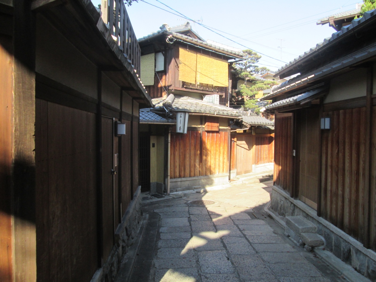 いわゆる”ねねの道”の一角から”石塀小路”へ入りました。入口あたりは風情のある木造の塀を持つ旅館や料亭などが並んでいます。このまま小路を進んで行くと、間もなく石塀や土塀が目立つようになります。私が幼い時を過ごした場所が、まさにこうした場所で、思わず懐かしさがこみ上げました。