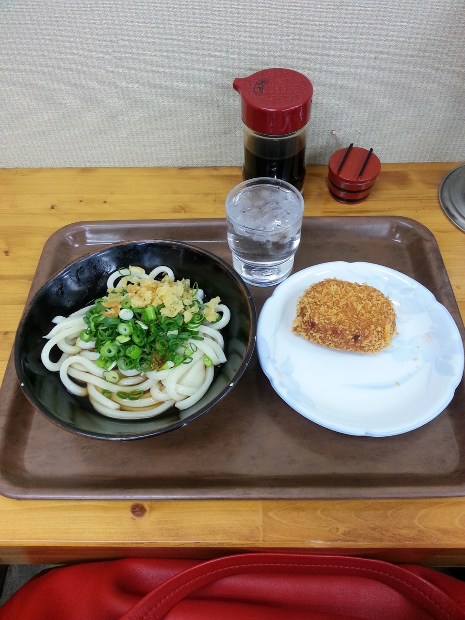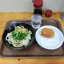 セルフサービス、シンプルな讃岐うどんにコロッケをトッピングです。