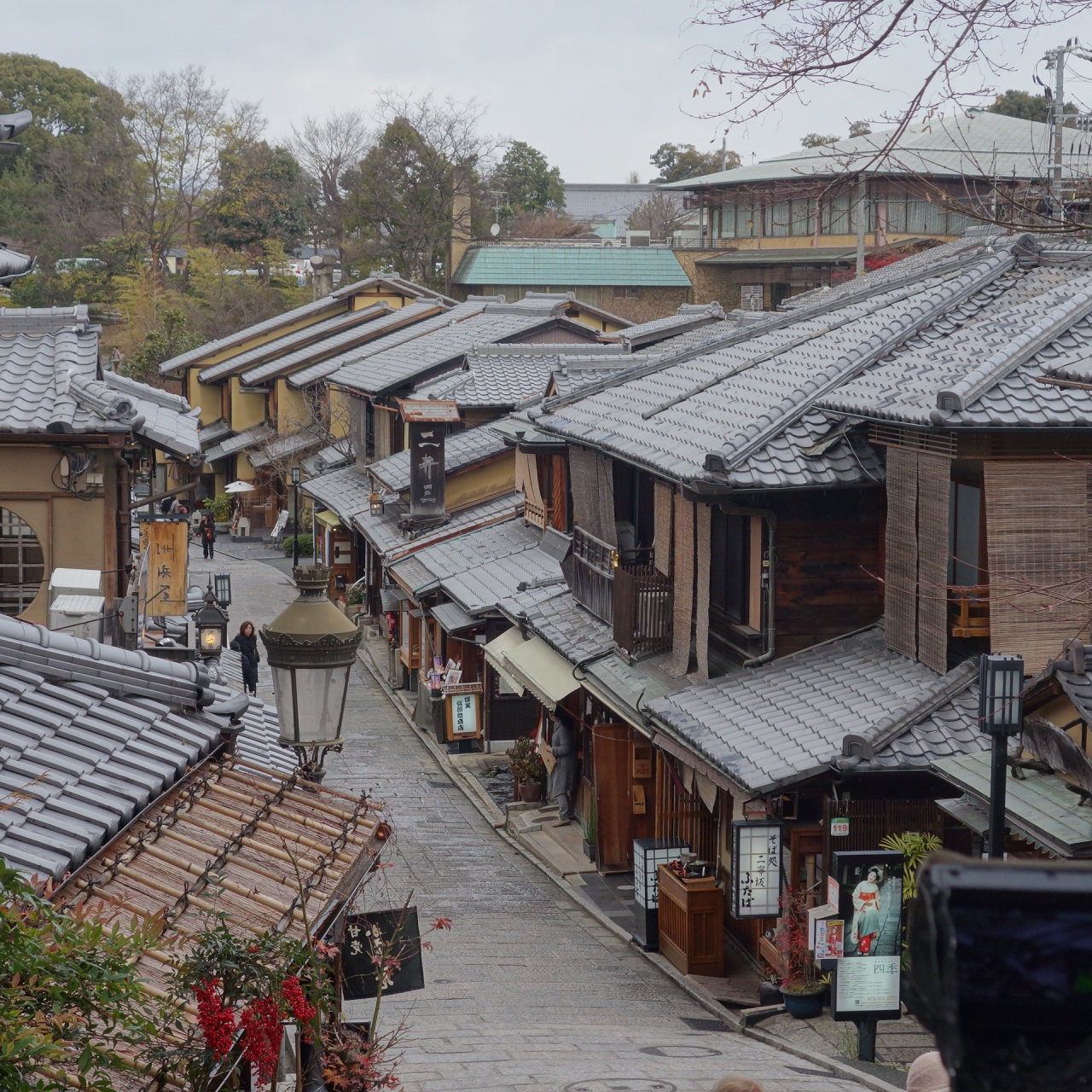京都で一二をあらそう観光の名所です。いつもおおぜいのひとで混んでいます。たのしいお土産物屋さんや食べもの屋さんがいっぱいならんでいるので,ぶらぶらするだけでも時間をわすれます。とっても楽しいところです。ずっといくと,もちろん,清水寺になります。