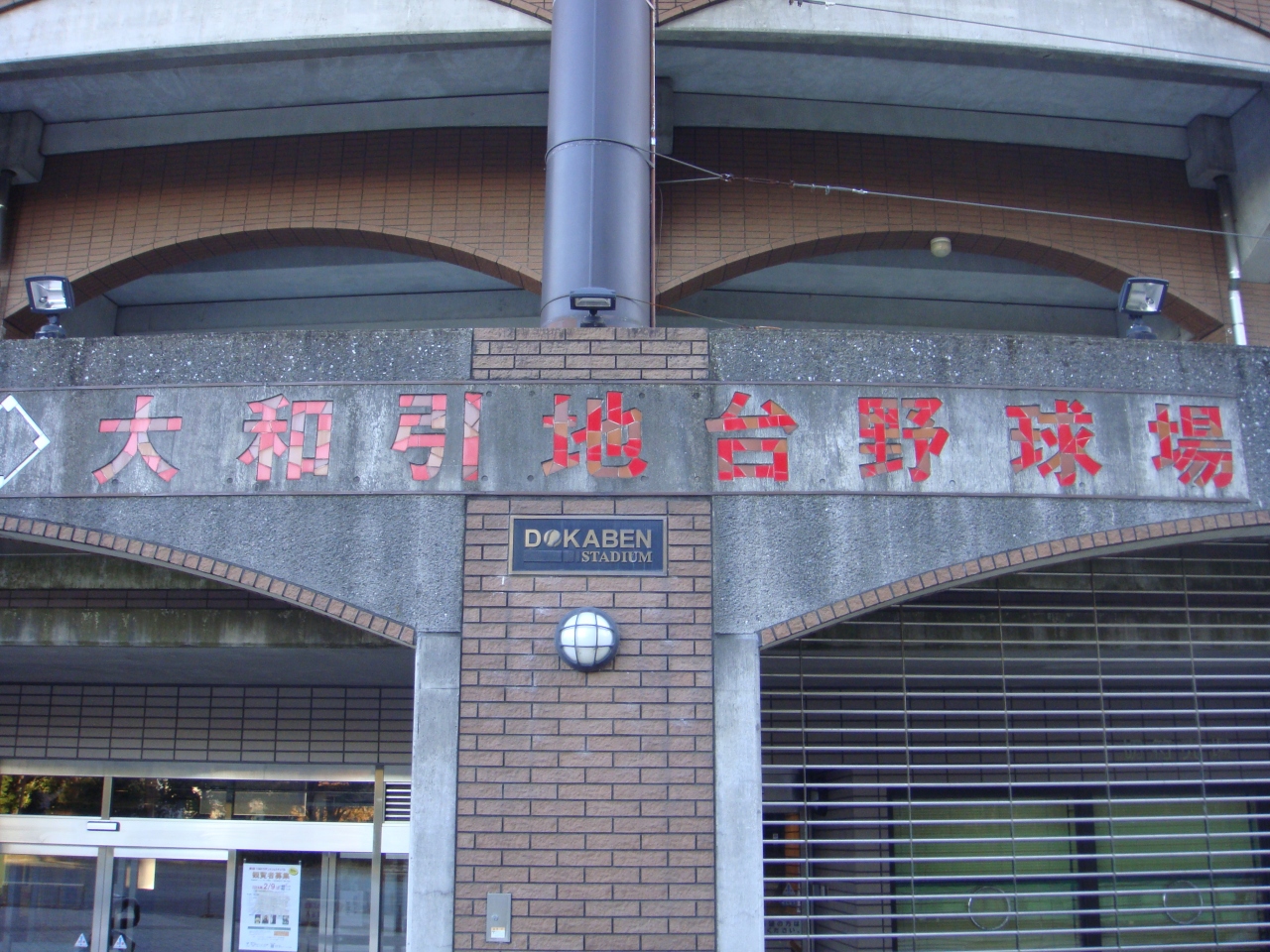 引地台公園内にある野球場で、別名ドカベンスタジアムです。球場の前にはマンガ『ドカベン』著者の水島新司氏のご協力により、ドカベンなどキャラクターのブロンズ像や壁画があります。水島新司氏と大和市は何のかかわりはありませんが、「ドカベン」の舞台が神奈川県だからというだけのようです。