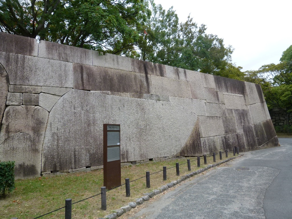 大阪城の石垣というと巨大な石も見どころです。大阪城にある石垣で一番大きなものが桜門にある蛸石(たこいし)、その次に大きいのが肥後石のようです。大阪城・京橋口から入ると両脇に石垣があって、その奥の真正面に見えるのが肥後石です。大きな石は畳よりも広く見えるのは私だけでしょうか。