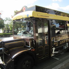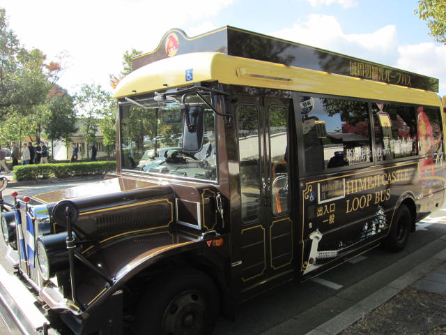 姫路の山陽百貨店前のバス停から姫路城を一周するレトロな観光バス。1日券は300円、1回100円ですが、距離が短く乗り降りして楽しむことはないので、往復以上の利用はないかと思います。おおむね土日は15分おき、平日は30分おきに運行されています。