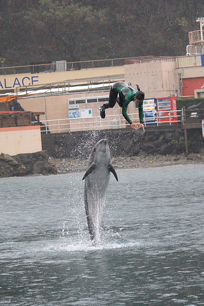 下田駅からバスで10分ほどのところにあります。中央にあるイルカの展示場所が自然の入り江を利用して作られており、砂浜近くをイルカが泳いだりもします。イルカショーも行われますが、広い場所を利用してダイナミックなものが見られます。これとは別にカマイルカのショーが行われるプールもあります。また、メイン水槽も海に浮いている状態になっています。