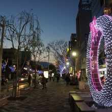 堺東イルミネーションは、堺東駅からすぐ。駅の職員に聞いたんですが、よく知らないよう。さんざん調べて、シンボルロードでやっていることが分かったんですが、駅からちょっと距離があるみたいでした。でも、せっかく来たので向かうと、あっという間に到着。ポスターで見た大きなわっかのイルミネーションが歩道に立っていました。暖かみのある光にけっこう癒されました。なかしんの商店街も近くにあって、これもついでに散策しました。