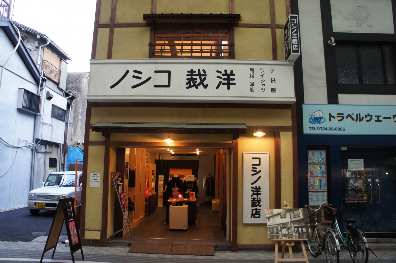 コシノ洋裁店は、岸和田駅前商店街のなかほど。NHKの朝ドラカーネーションのヒロイン「小原糸子」のモデル、「小篠綾子」さんの店舗を復刻したものだそうです。また、この店舗は世界的デザイナーとなる三姉妹の生家でもあります。