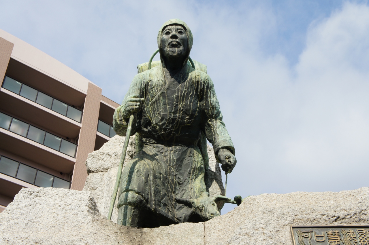 河口慧海の銅像は、七道駅の前。近くには、河口慧海の学んだ清学院や生家跡もあります。ちなみに、河口慧海は、中国や日本に伝承されている大乗仏教に疑問を持ち、より仏陀本来の教えに近い小乗仏教のチベットに入国。日本人として初めて入国するとともに、チベット語仏典を収集することに成功した人物です。