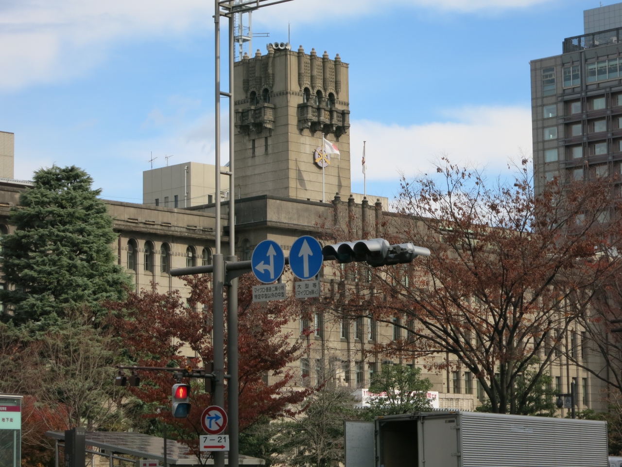 京都 河原町御池、京都ホテルの正面に京都市のシンボルである京都市役所本館があります。昭和2年に東側、昭和6年に西側が立てられた市役所本館は今でも現役です。市役所の前は広場になっており市民の憩いの場となっています。