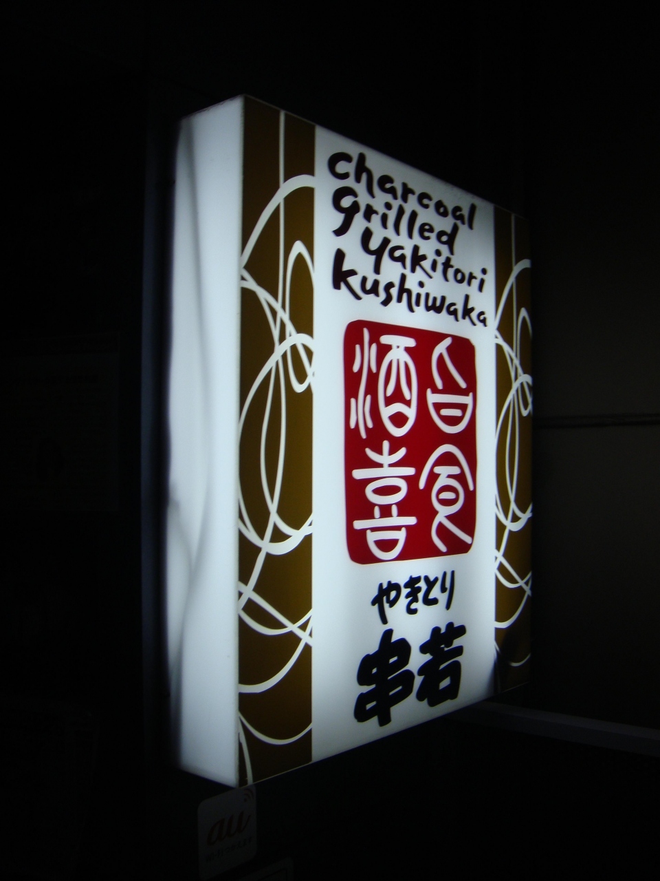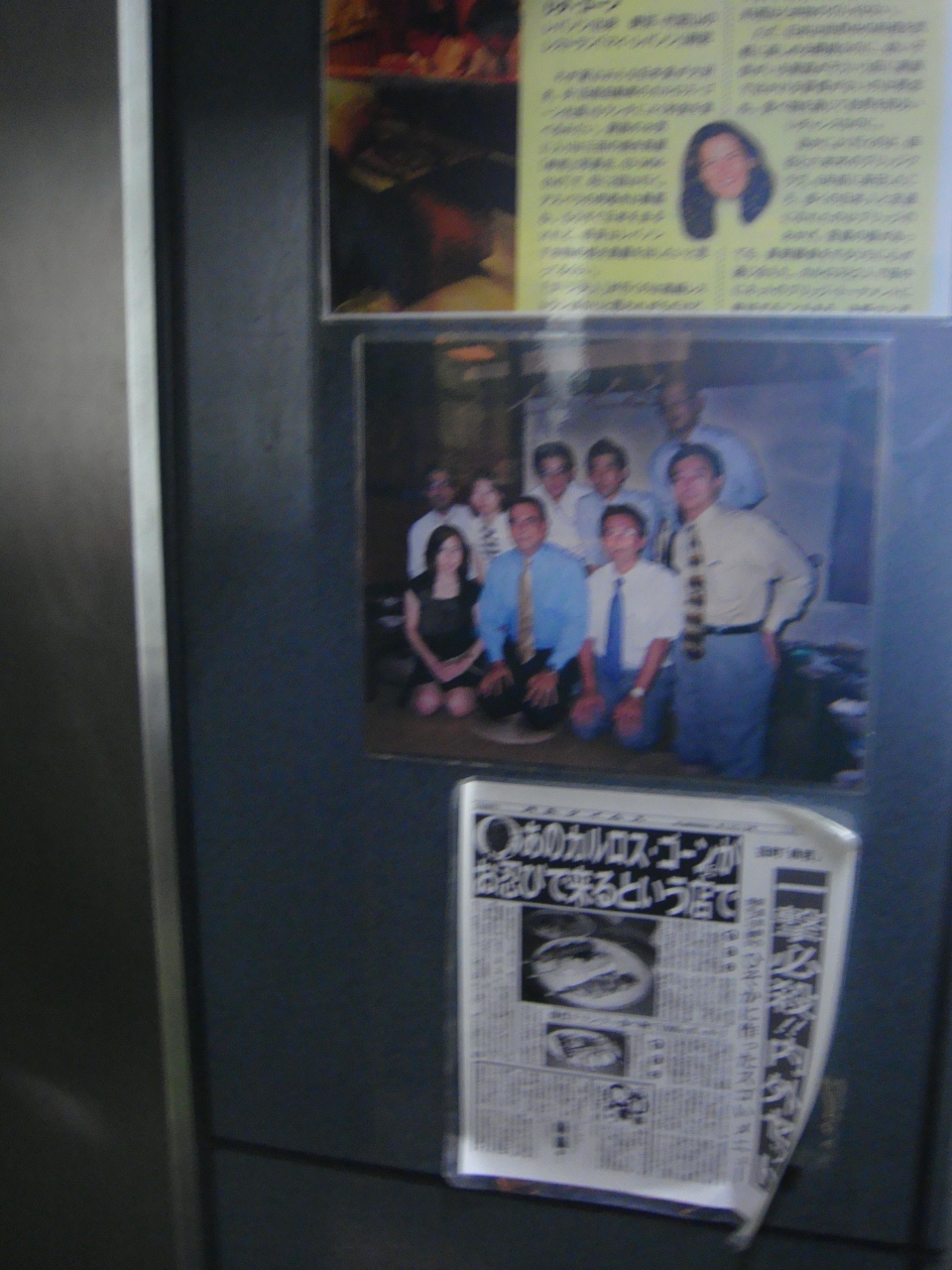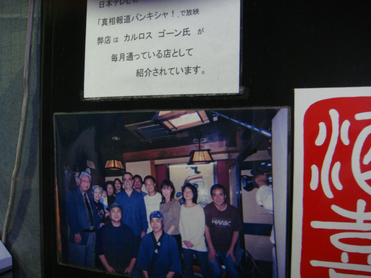 カルロスゴーン御用達のお店として有名な「串若」は、田町駅徒歩5分程、三田図書館前の雑居ビルの2階にあります。店のドアには噂通り、カルロスゴーンの写真が・・