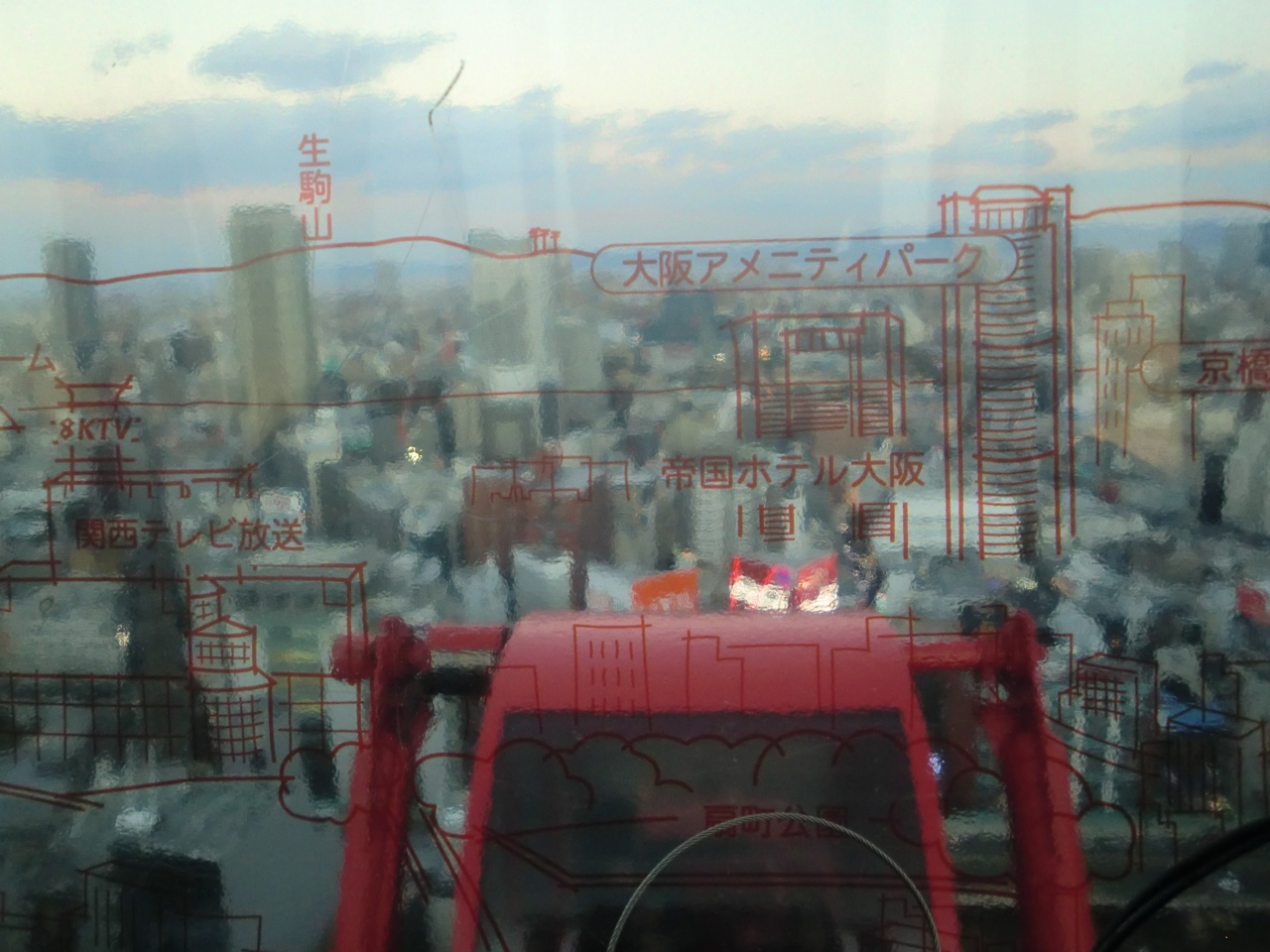 大阪駅周辺のHEPの観覧車へ。大阪周遊パス2000円で1日乗り放題のため観覧車に。500円がフリー。観覧車のフロアーは飲食フロアー。夕暮れ時に乗ったので、大阪の街並みが良く見えた。都会の観覧車もおつなもの。観覧車内の窓には遠景の形が窓に書かれており、遠景の説明となっている。工夫している。http://www.hepfive.jp/kanran.html