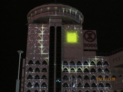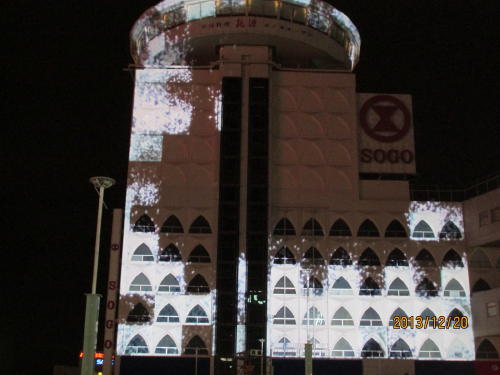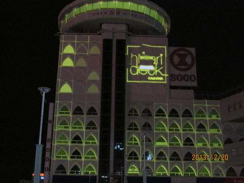 クリスマス間近、各所でライトアップのイベントが多い中、「ヒカリデッキかしわ 2013」が平成25年12月20日(金曜日)、21日(土曜日)、22日(日曜日)の3日間開催されます。既に予約は締め切りました。プロジェクションマッピング(建物に映像 を映し出す技術)を柏駅東口の百貨店そごう柏店の壁面に映し出します。窓の形やエレベーターの形に合わせた影像をプログラミングしています。