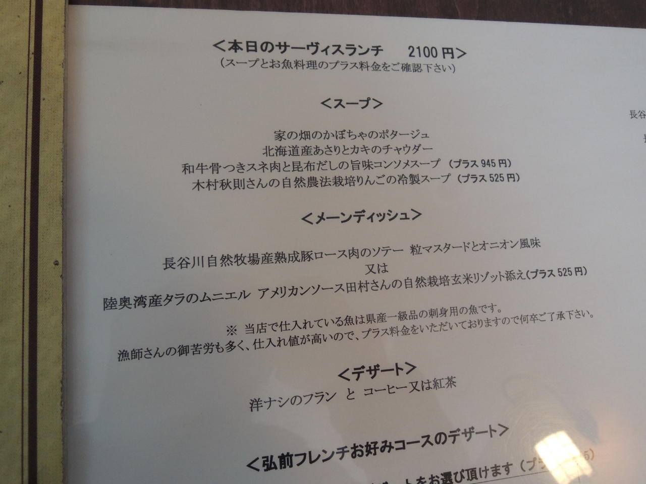 弘前のフランス料理の名店と聞き訪ねる。駅からは天気がよければ1階の観光案内所で自転車を借り市内散策しながら立ち寄るのがお奨め、1日500円。または駅前からの循環100円バスで土手町下で降り徒歩2~3分すぐです。近くには洋館、弘前城も散策にもいいロケーションにあります。ランチは2100円からです。気兼ねすることないカジュアルな感じのレストラン。