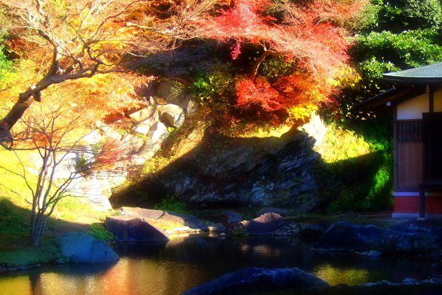 仏殿後方の方丈庭園は建武年間に夢窓疎石(むそう そせき 1275-1351、鎌倉時代末から南北朝時代、室町時代初期にかけての臨済宗の禅僧)が作庭したものといわれるそうで、この庭は、「妙香池」と称する心字池を中心に築かれ、池は岩盤を掘り下げてつくられたものなのだそうです。 池の北岸にあたる山側には、波浪の浸食を擬したという虎頭岩が配されています。