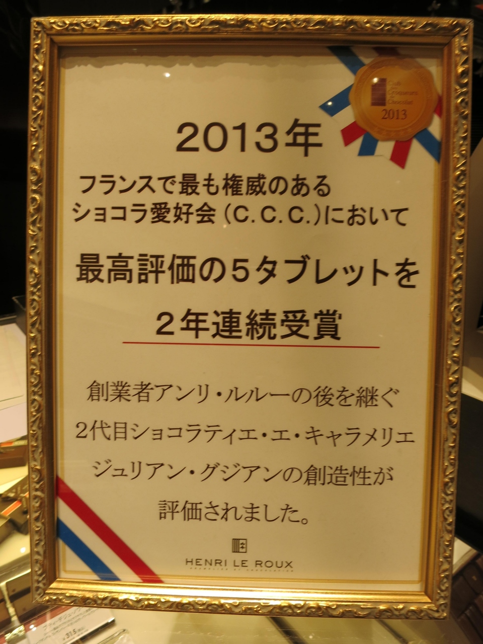 東京ミッドタウン B1Fあるフランス・ブルターニュ出身の世界で唯一のキャラメリエ(キャラメル職人)として知られるアンリ・ルルーのお店です。塩バターキャラメルが有名ですが、他にも20種類近くあり、季節限定のキャラメルもありました。一個150円ほどする高級キャラメルです。店にはカフェも併設されています。