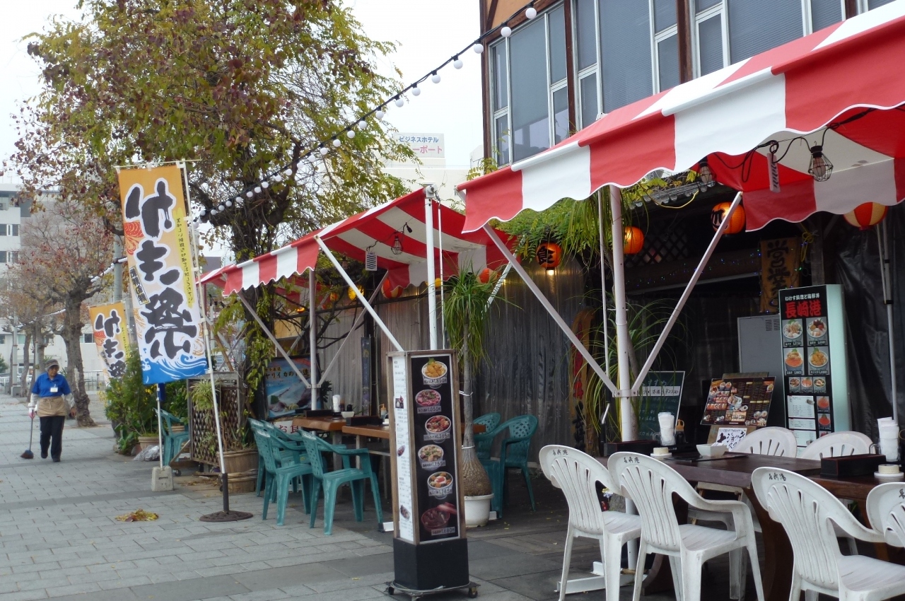 軍艦島から帰った13時過ぎに行ってきました。時間が時間だからか閑散としていましたが、その中の一つのどんぶり屋に入ったのですが、料理はそんなに高くないのにボリュームがありおいしくてここを選んで良かったと思いました。もし気候が良かったら外で食事をするのも良いと思います。