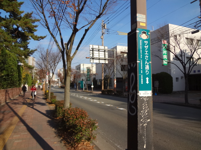 「サザエさん」の作者である長谷川町子さんは、この百道の海岸を散歩しながら、サザエさん、カツオくん、ワカメちゃんなど、登場人物の発案をしたと言われています。この通りは、平成24年に命名されたそうで、西新通り交差点横の磯野広場にはサザエさん発案の記念碑が置かれています。