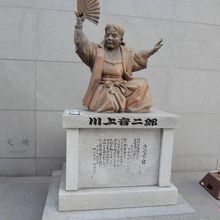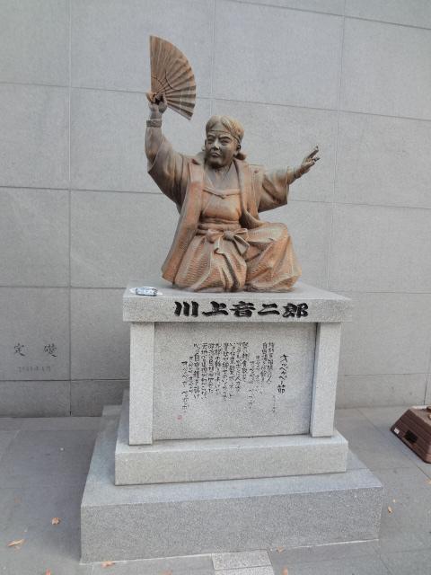 地下鉄中洲川端駅のすぐ近く、川端商店街の、リバレイイン側入口のところに建てられています。川上音二郎は、「新劇の父」と言われる人です。福岡藩出身の人で、「オッペケペー節」で一世を風靡した興行師だそうです。川上の始めた芝居はやがて新派となり、旧劇(歌舞伎)をしのぐ人気を博したそうです。