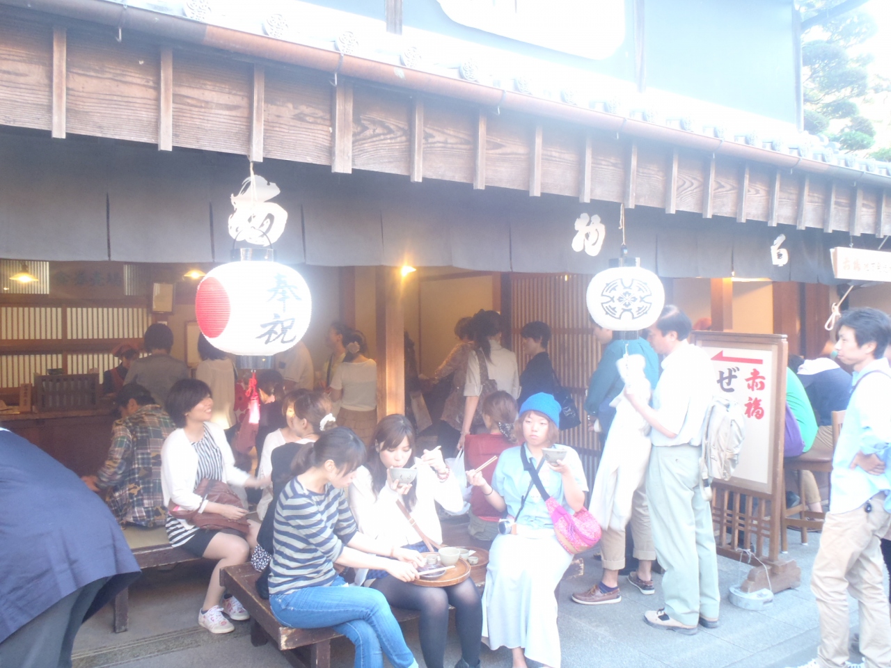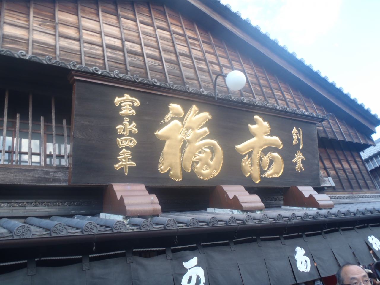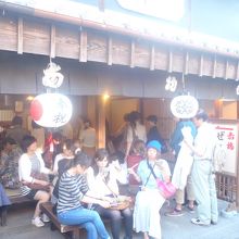 建物は明治以来130年、伊勢らしい切妻屋根は間口を広げるために高くし、正面に掲げた横書きの大きな看板には金色で赤福の二文字。