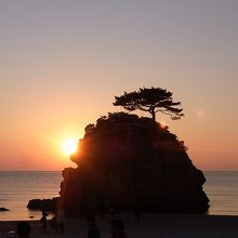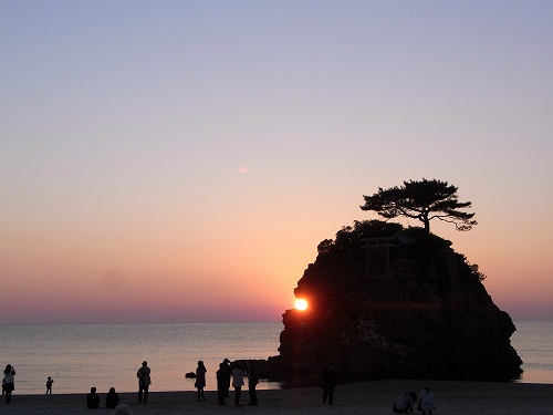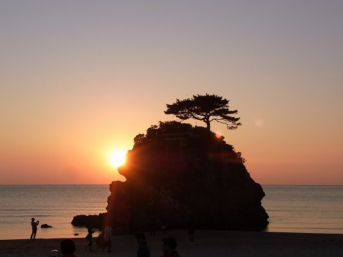 自分の立つ位置によって、夕日が弁天島の左のちょうどかけたところに夕日が入ります。