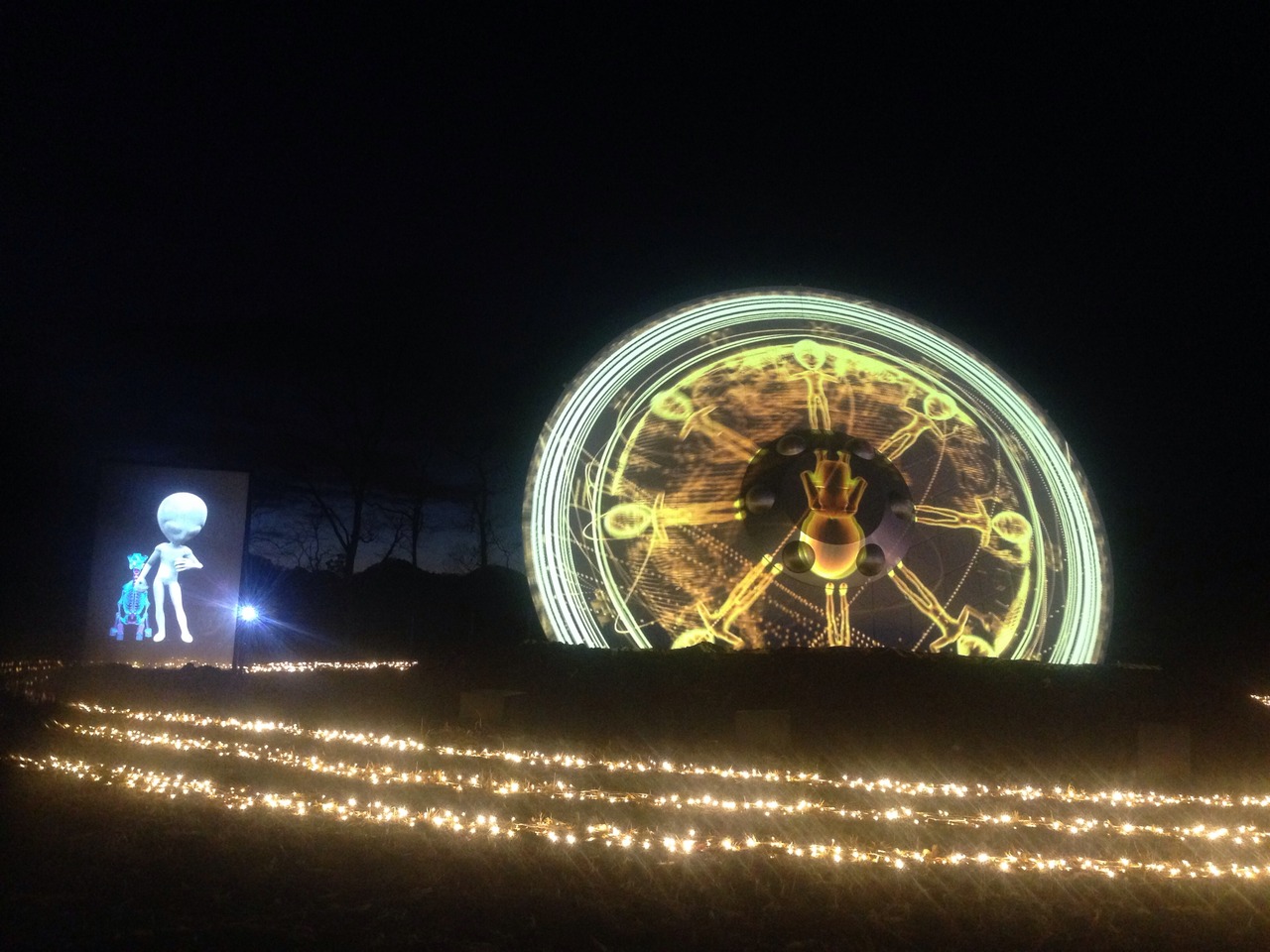 今年初のUFOのプロジェクションマッピングは、期待していたけれど、思ったより規模が小さく、若干物足りなかったです。宇宙人のダンスは可愛かったです。