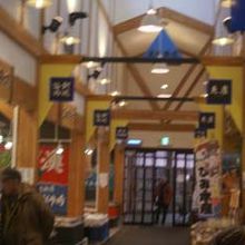 氷見温泉郷総湯に入った後、すぐ隣にあるひみ番屋街に寄っていきます。外から見ると湯気抜きがり、湯小屋かと思いましたが、中に入ってみるとお土産物屋や、飲食店、海産物を売る店が並んでいて、ゆっくりお昼でも食べていきたいところですが、列車の発車まで時間がないので残念ながら中を素通りしました。