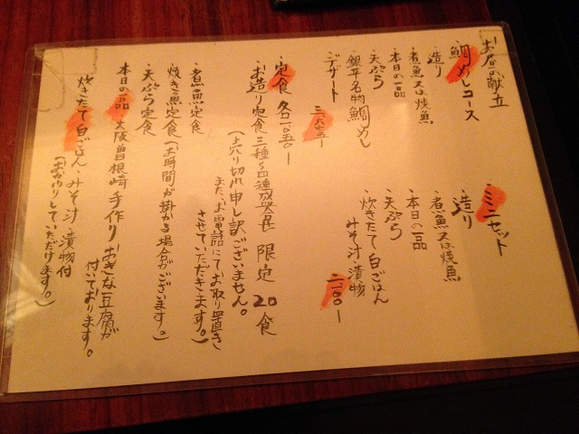 定食が1050円で提供され、5種類くらいの魚のうち1種類を、煮魚、焼き魚、天ぷら、お造りにすることができます。