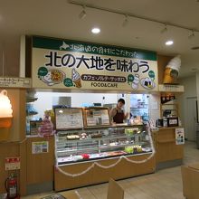 カフェに入る手前では、海産物や乳製品などの地場物のお土産を販売しているほか、隣は観光案内所の受付カウンターがあり、道内の観光名所、市区町村のパンフレットが種類豊富に置かれています。