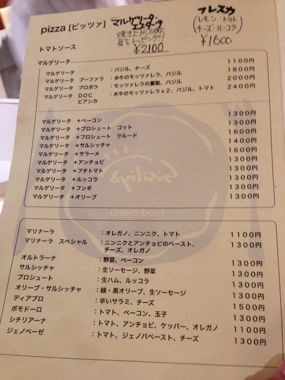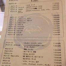マルゲリータ、マリナーラは1,100円。マルゲリータ+生ハムで1,600円。