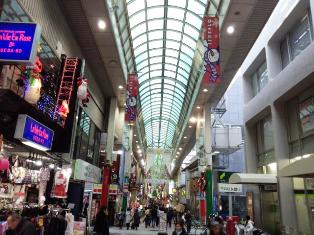 京阪電車の伏見桃山駅を降りてすぐ始める大手筋商店街。各地の商店街はシャッター通りが多いようだが、ここは昼間もかなりの人で賑わっている。飲食店などもあるので、昼食を食べるにも便利である。アーケードがあるので雨の日の買い物も安心だ。
