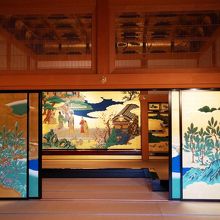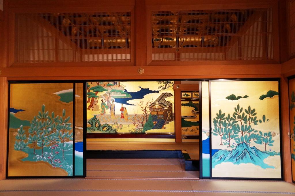 御殿を順路に従って進むと、大広間を過ぎ立派な縁側を進んでいくと豪華さが目を見張る、昭君之間が姿を表します。金色をふんだんに使った壁や襖、床の間、飾棚には見事な絵が描かれおり、その中でも悲劇のヒロイン女性の姿は印象的でした。