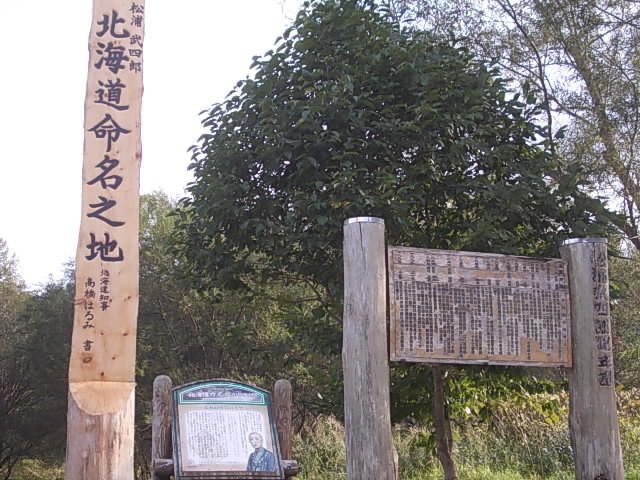 今では誰でもご存知の「北海道」という日本の中心四島の中で最北にある島の地名ですが、その名前としての歴史は意外に浅く、その命名は、北海道内の踏査で知られる松浦武四郎と現在この碑が建っている場所付近に当時住んでいたアイヌ民族との出会いがきっかけとなっています。現在ではちょっとした名所になっていて、この地の重要性をアピールしたいからなのか、2013年現在現職の北海道知事である高橋はるみ氏の自筆による碑が存在感を示していました。