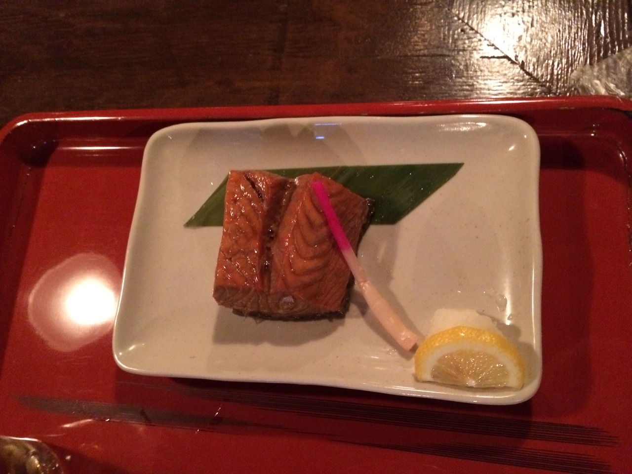 新潟の地酒はすべて揃っているとのことです。メニューも新潟を感じさせるものばかり。目移りして困りましたが、お通しの豚肉の陶板焼きを始めに、南蛮エビの刺身、鮭の焼漬、酒盗とウニとイクラのサラダなどをいただきました。