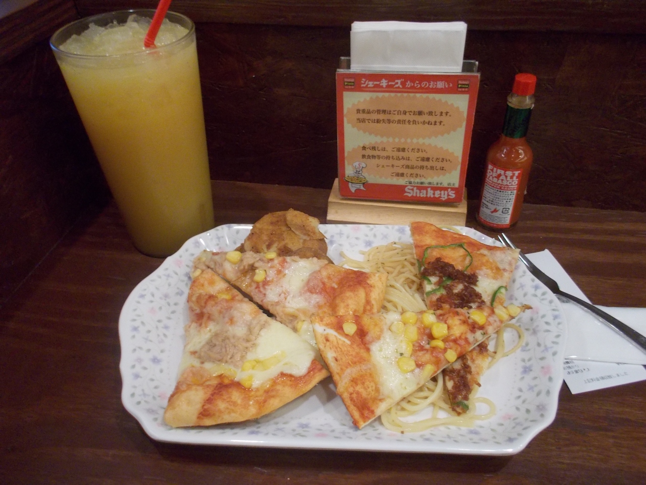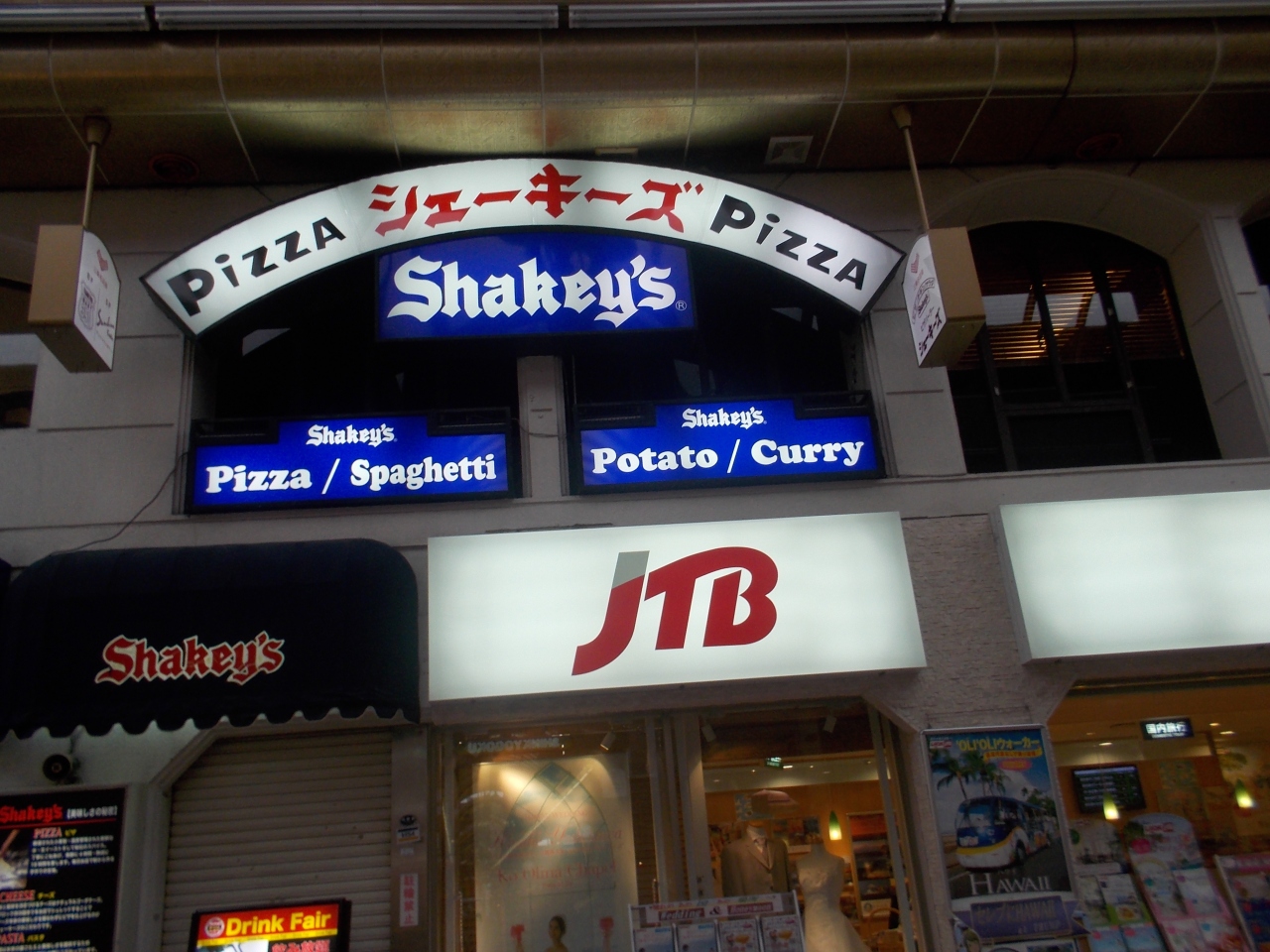 三条河原町の京都市役所から新京極に入って、四条に向かう途中にあります。 1階がJTBが入っているビルの二階にシェーキーズがあり、パスタとピザが食べ放題です。 ピザはいつも焼きたてなので、新鮮で、リーズナブルな値段で食べられます。