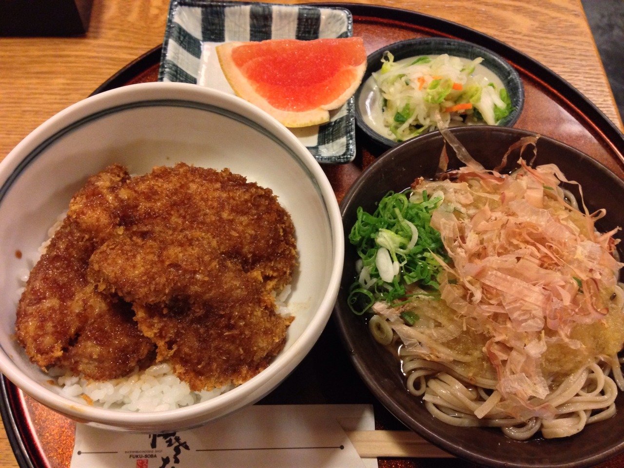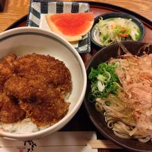 福井の名物二つが食べられる越前そばとソースカツ丼のセットと薬味の違う五色そばを注文しました。
