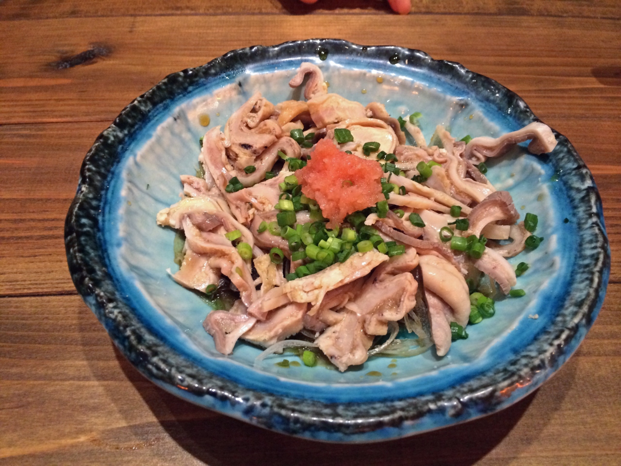 お通しは博多辛子明太子。やまや、かねふく、あごおとしの味比べが楽しめます。