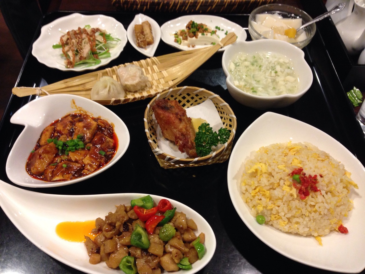 麻婆豆腐や唐揚げ、チャーハンに棒棒鶏サラダ、杏仁豆腐などいろいろ。