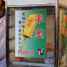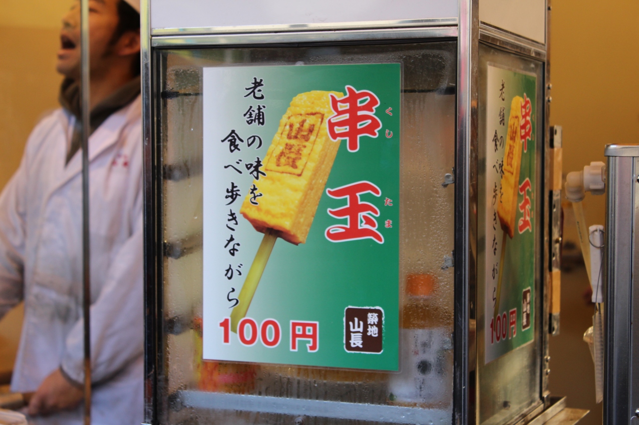 また、卵焼きを串にさしたものを1本100円で販売しています。場外市場を卵焼きを食べながら歩くというのもいい感じです。