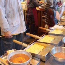 築地場外市場にある卵焼きの人気店のひとつと思います。卵焼きを焼いている姿を実際に見られるのは場外市場の中でも珍しいですから人もあつまります。