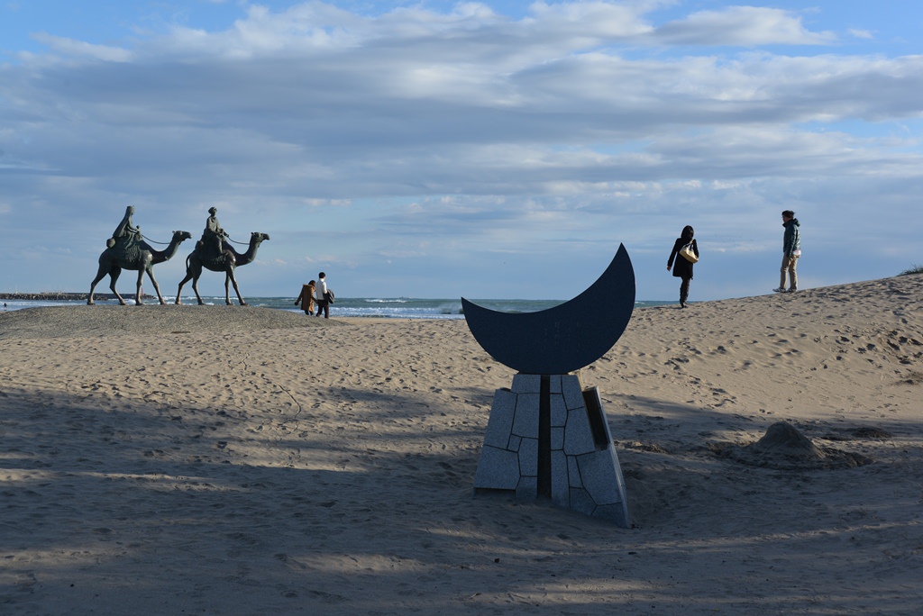 『月の沙漠』は作詞「加藤まさを」、作曲「佐々木すぐる」の作品で、知らない人はいない有名な歌です。加藤まさをが作詞した時代には、冬など誰もいない淋しい砂浜だったのかもしれません。一方、今や朝から晩までサーファーが波乗りを楽しむ海岸です。2頭のラクダのモニュメントの隣をサーフボードを抱えたサーファーが通り過ぎる光景は活気が感じられます。御宿に来たなら、御宿海岸と2頭のラクダ、そして月の沙漠記念館をセットで見物しましょう。さらにメキシコ記念塔にも行って高台から海岸の眺望をお楽しみください。
