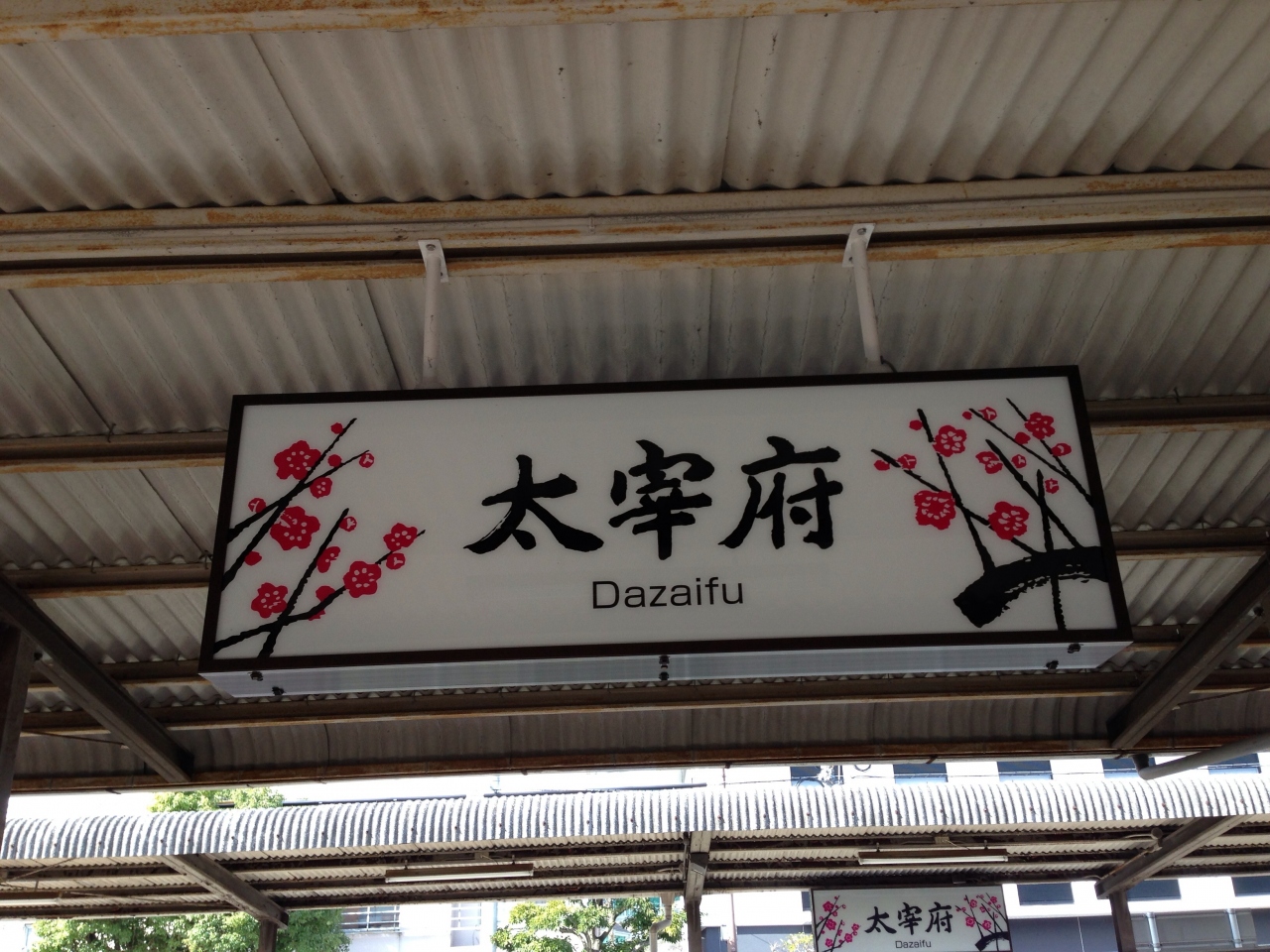 太宰府八幡宮にちなんで、梅が駅の看板にも使われております。駅の周りにも多くのお土産屋さんが軒を連ねてます。ロータリーも小さいながらあります。一時間に4本ほどしか出ない終点の駅。青色の古い電車が似合います。