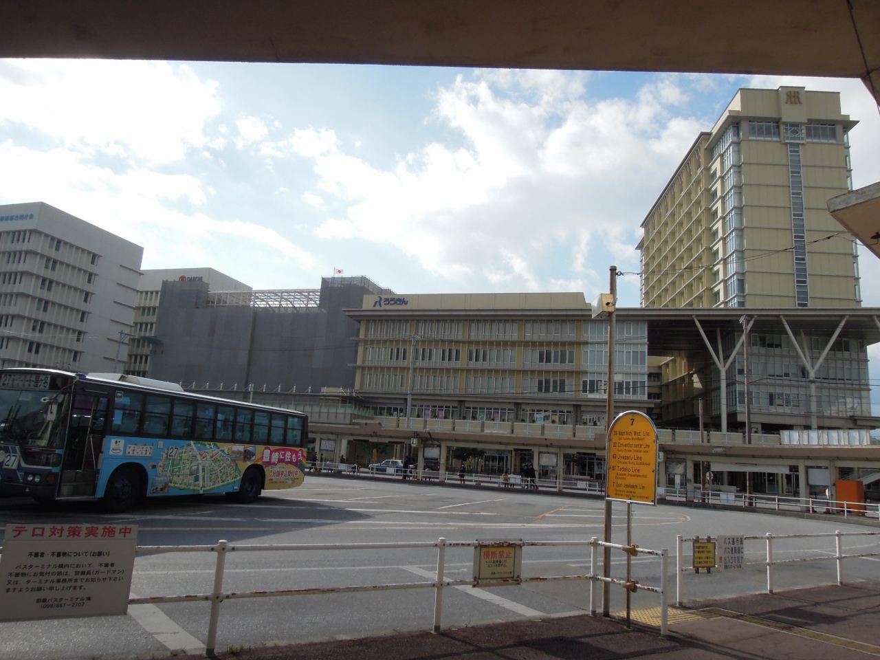 那覇バスターミナル周辺には「那覇バスターミナル」「旭橋」「バスターミナル前」「旭橋駅前」という異なる名前のバス停が密集していて、路線バスによりバス停が違います。慣れるまでには結構大変ですが、空港や観光案内所などにおいてあるバスマップにかなりわかりやすくまとめられていてすごく使えます。