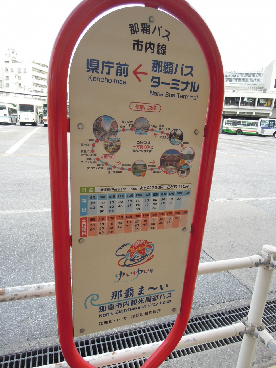 那覇バスターミナルから識名園を通り、首里城、石畳、DFSギャラリア、おもろまちに寄り、国際通りを突っ切って那覇バスターミナルへ戻ってきます。乗り降り自由で1回の乗車賃は220円です。3回以上乗り降りする場合は一日乗車券がお得です。