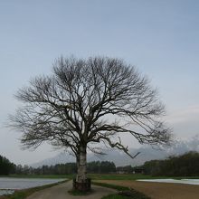 “ヤマナシ”は山梨県の県名の語源になった樹木で、食用の梨の原種です。昔は山梨県に多くあったそうですが、今は余りなく、八ヶ岳の東麓の野辺山高原に何箇所か名所になっているところがあります。中でも南牧村海ノ口の“海ノ口牧場”と南牧村の“板橋”のヤマナシが有名で、前者は長野県細大の放牧場の中に、後者は畑のあぜ道の中にあります。どちらも花が咲いたら多くの写真愛好家が訪れるそうです。5月の初旬に行きましたが花は未だ咲いていませんでしたが、左右対称の見事な枝ぶりは雪を残した八ヶ岳連峰とマッチして、見事な光景でした。添付写真は映画などの撮影も行われたことのある“板橋”の畑のあぜ道の中にあるヤマナシの木です。