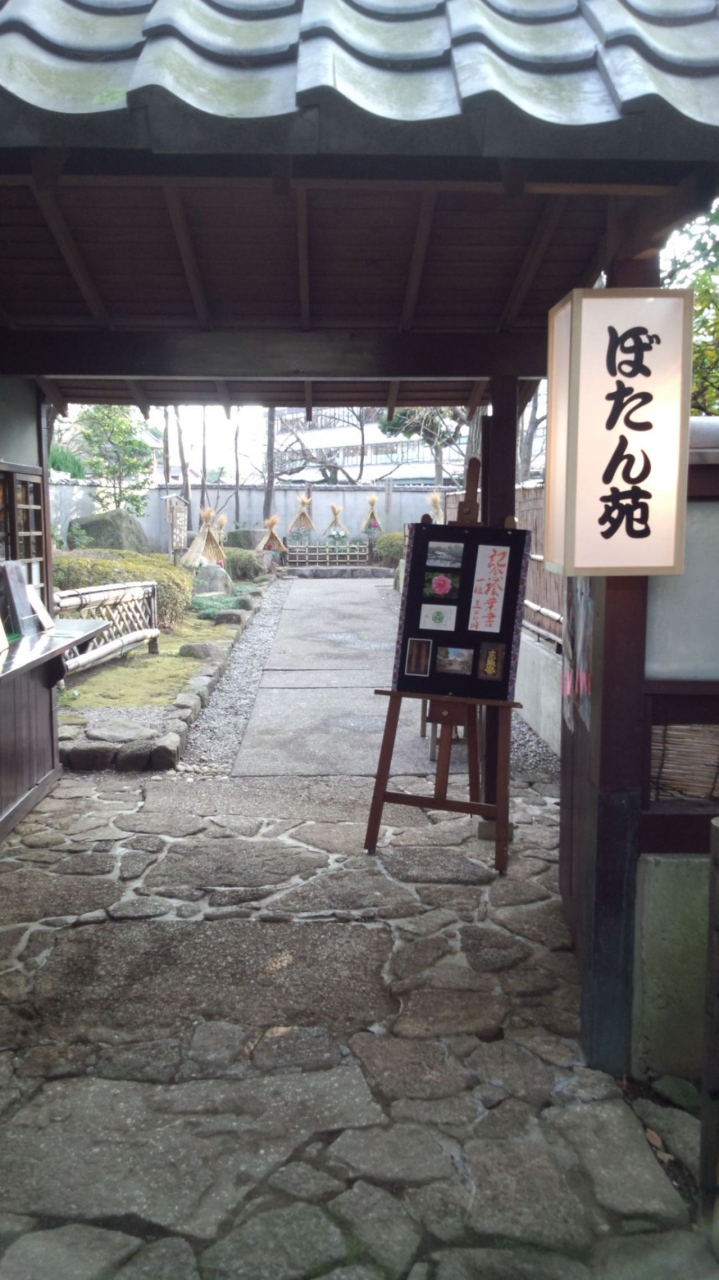 流石に歌に読まれるだけの事はあります。赤や白の花が藁の間から披露されており、遠目でもハッキリ拝見出来ます。拝観料が社殿と牡丹園共通券 千円、牡丹園のみへ600円と高いです。今日は初詣優先して、牡丹は垣根の間から拝見しましたが、緋毛氈をかけた長い几─行木?でしたっけ─の上に火鉢がありBGMに琴の曲が流れ雰囲気たっぷりで見応え有りそうです。垣根の間から覗けるので~(*^_^*) 本当に美しい~