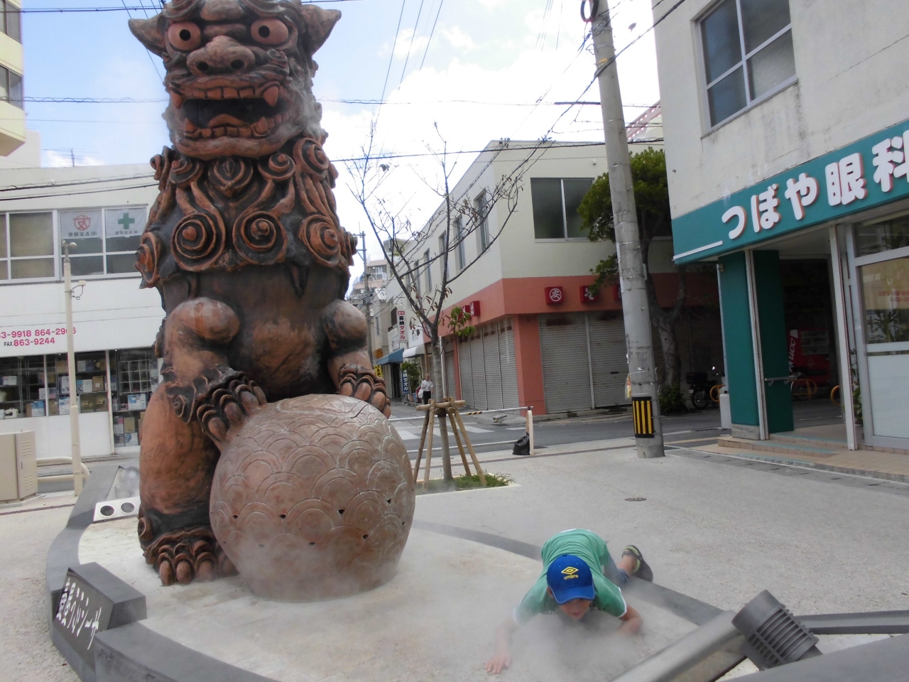 牧志市場の食堂で昼食後、商店街を抜けてやむちん通りを目指したところ、シーサーの銅像を発見。時間で水のシャワーが出る仕組みです。