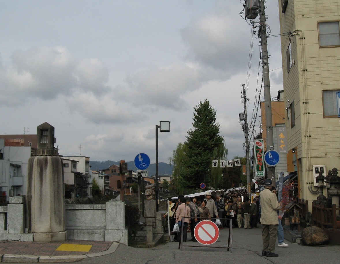 飛騨高山の朝市は、江戸時代から、米市,桑市、花市などの市として発達し、明治の中頃から、農家の奥さんたちによって野菜がならべられるようになり、朝市とよばれるようになったそうです。朝市は、毎日、朝6時ごろから12時まで、宮川沿いと、陣屋前広場の二箇所で開催され、新鮮な野菜、果物、お漬物、味噌、民芸品、花、飛騨民芸品がならんでいます。団体の観光客が比較的少ない、朝できるだけ早い時間に行くのがいいと思います。