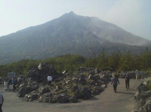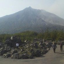 山の右(東)側8合目あたりに現在活動中の昭和火口があるらしく、活動している桜島の姿を間近に見ることができるスポットです。最初に見た湯之平展望所よりも煙を出す活発な姿が見られ、そして音が聞こえる場所でした。